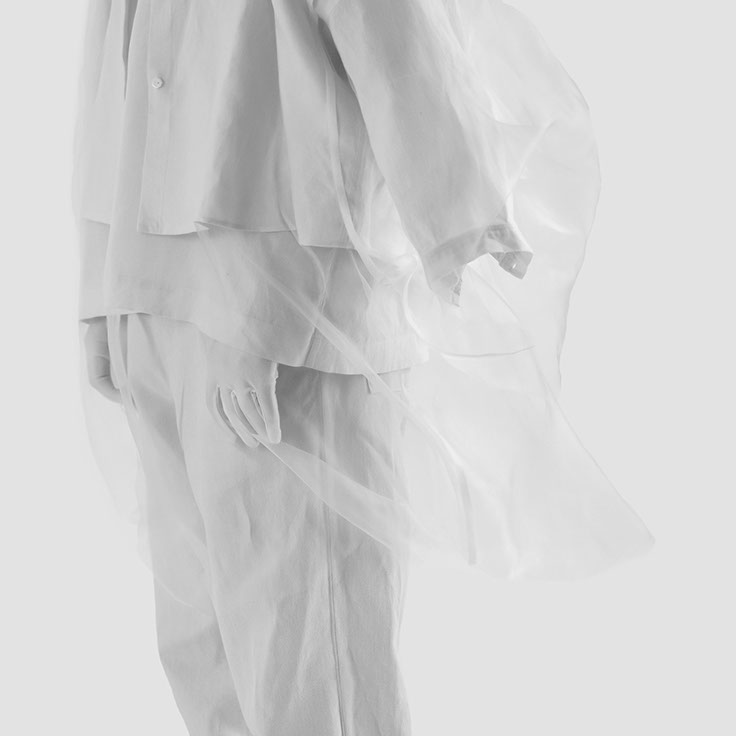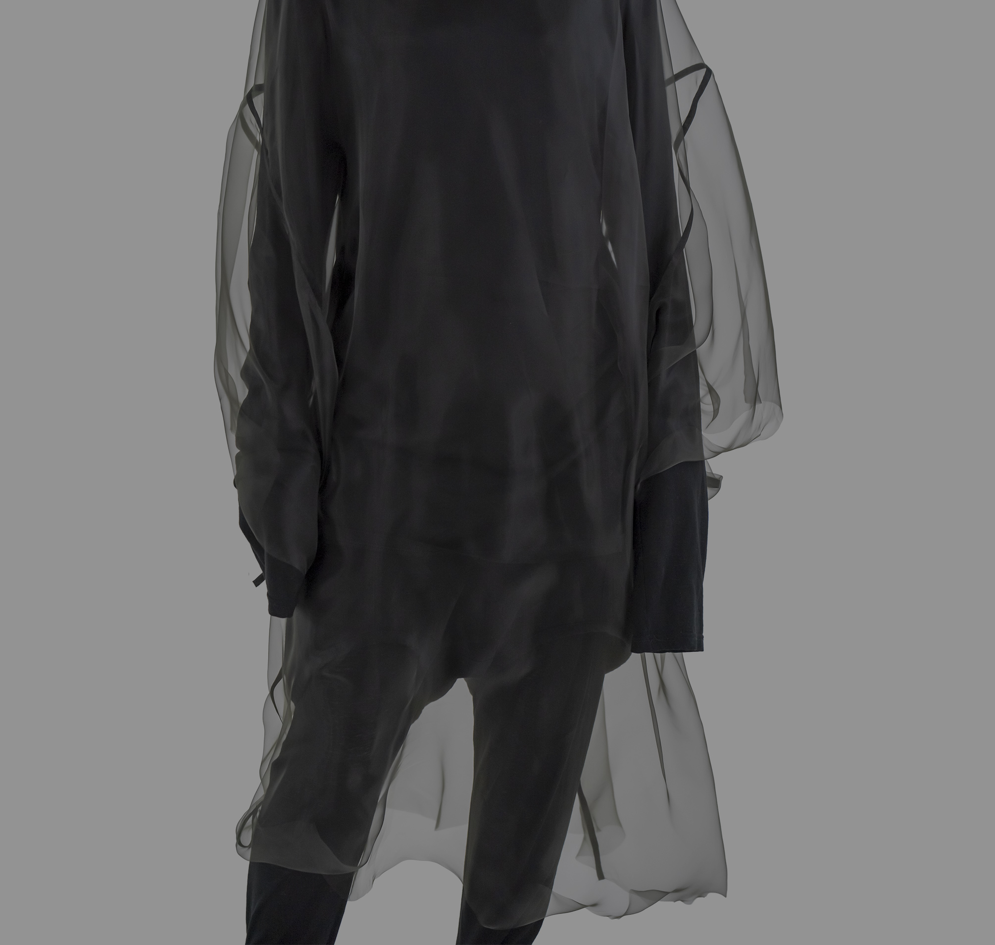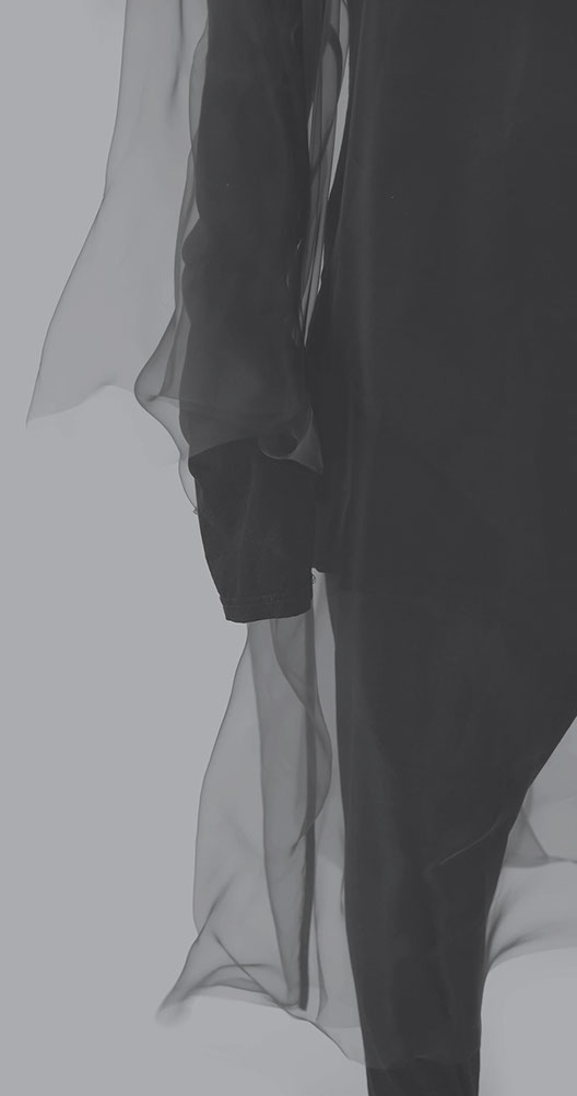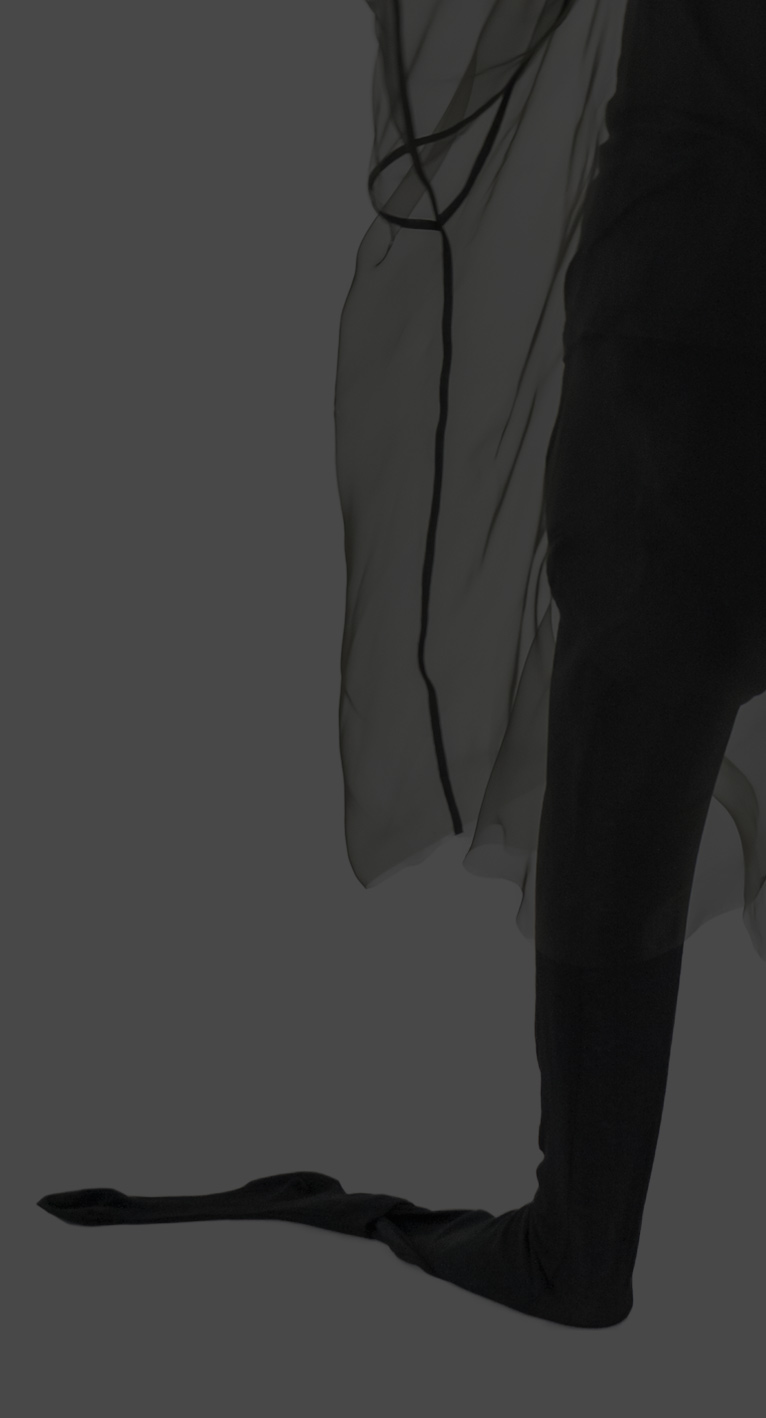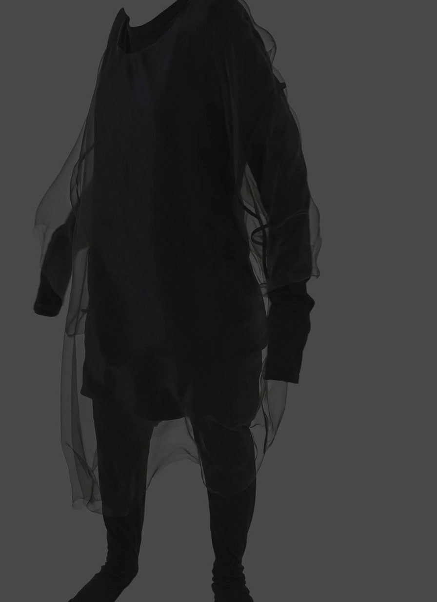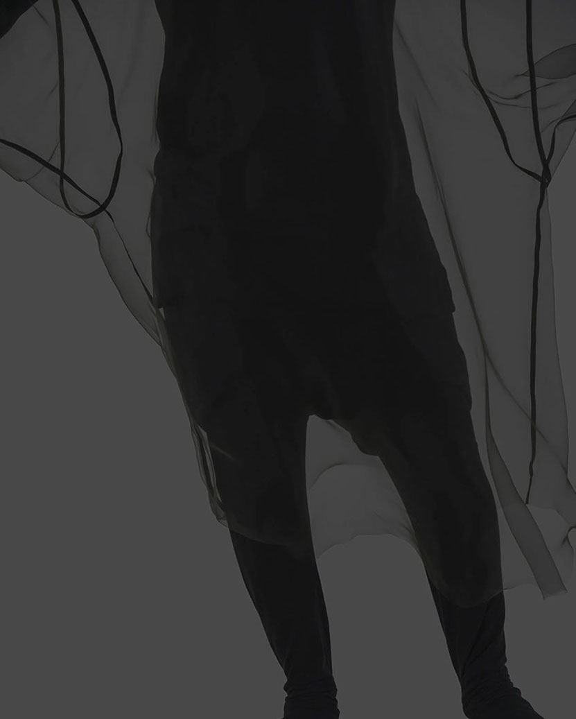 myself: I choose black and white, to keep this layer within the realm of dreams, .. I believe we do not dream in colours, though I might be wrong. When worn over garments of similar tones, OF A dress appears, disappears and reappears, enhancing this feeling that it visits the body on a temporary note.
