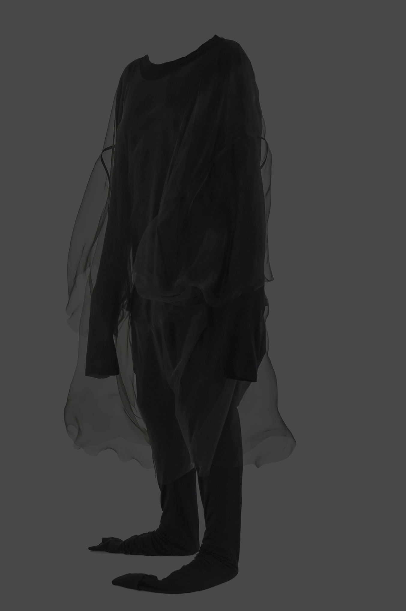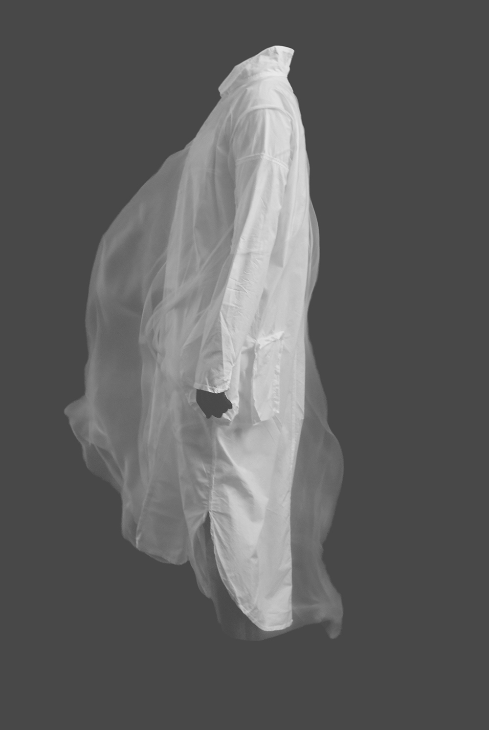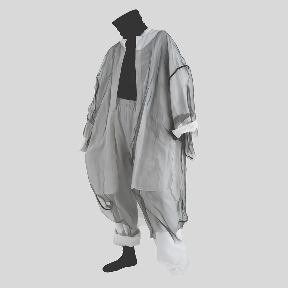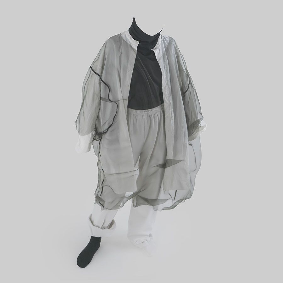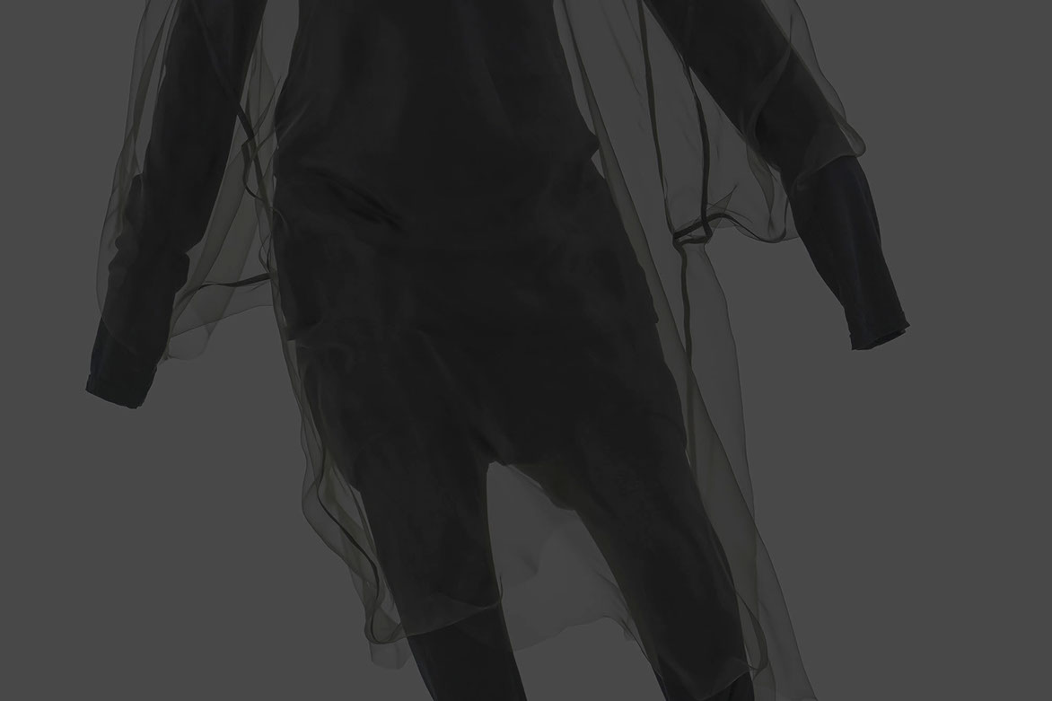 myself: I choose black and white, to keep this layer within the realm of dreams, .. I believe we do not dream in colours, though I might be wrong. When worn over garments of similar tones, OF A dress appears, disappears and reappears, enhancing this feeling that it visits the body on a temporary note.