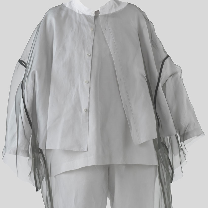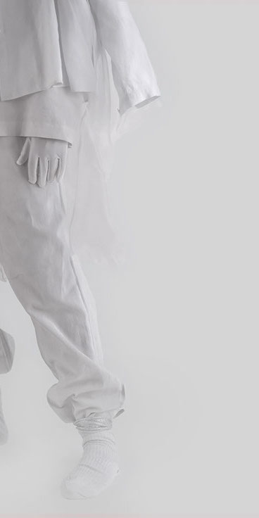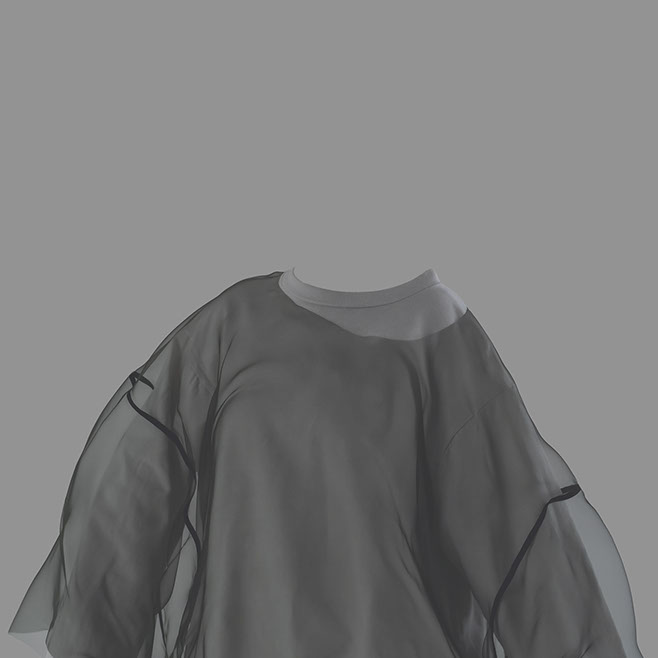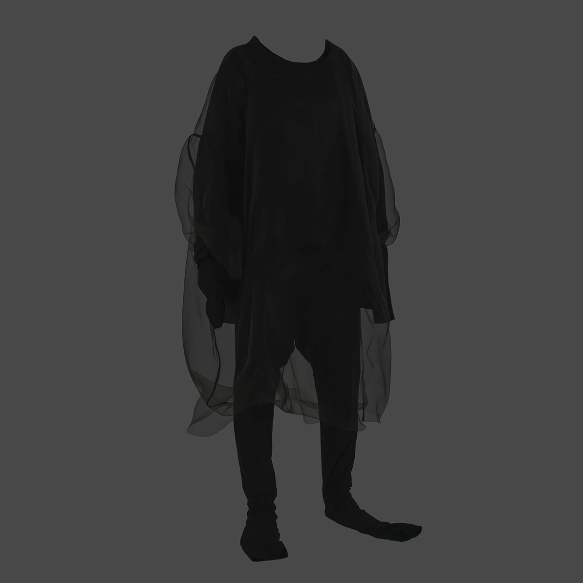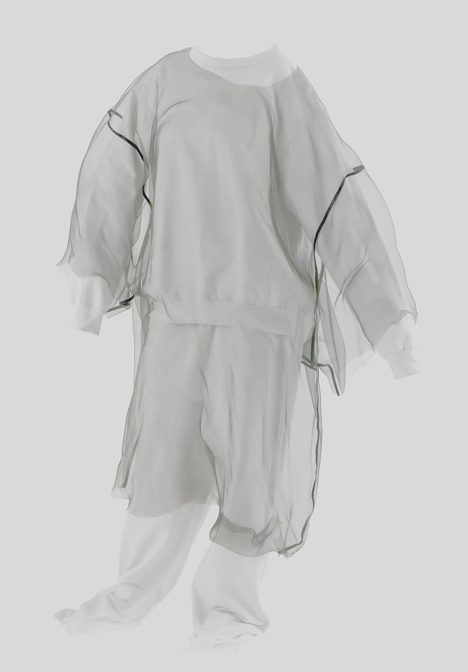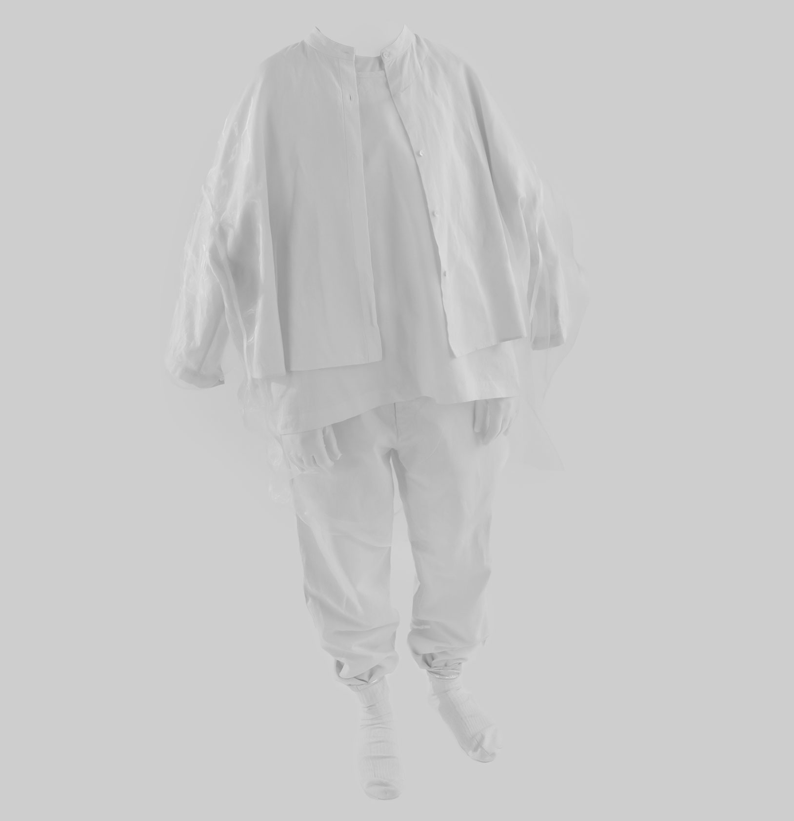 myself: I choose black and white, to keep this layer within the realm of dreams, .. I believe we do not dream in colours, though I might be wrong. When worn over garments of similar tones, OF A dress appears, disappears and reappears, enhancing this feeling that it visits the body on a temporary note.